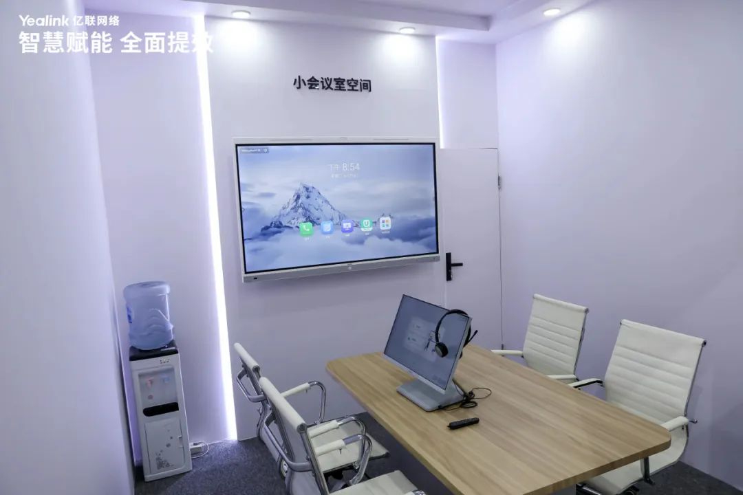 现代企业追求更高效率的会议生产力,强调“快、简、沉浸”的核心体验,且对终端设备提出高集成度和智能化的要求,力求简化布线与运维流程。在本次展会中,亿联精心布置了中大型与小型两种规格会议室,生动展示了其三屏三显方案及音视频会议平板,以卓越的音视频效果赋予参会者沉浸式体验。