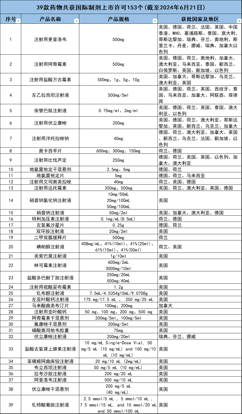 普利制药从事药品国际化开拓以来,产品已销往美国、德国、法国、荷兰、英国、加拿大、澳大利亚、意大利、西班牙、丹麦、捷克、乌克兰、泰国和马来西亚等多个国家,已形成了中国制造、全球销售的国际化格局。截至2024年6月21日,39款药物共获国际制剂上市许可153个。