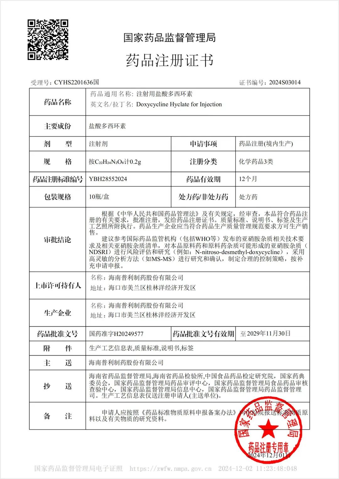 海南普利制药股份有限公司(以下简称“普利制药”或“公司”)于近日收到国家药品监督管理局签发的注射用盐酸多西环素(规格:0.1、0.2g)的药品注册批件,视为通过一致性评价批准上市,将为拓展国内市场带来积极影响。