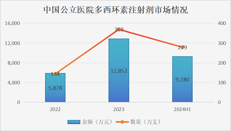 根据米内网的数据,近几年,多西环素注射剂市场销售增量可观,2022年~2024年H1(H1:上半年)的销售额分别为5800万元、12800万元、9200万元,平均年增长率高达73%。