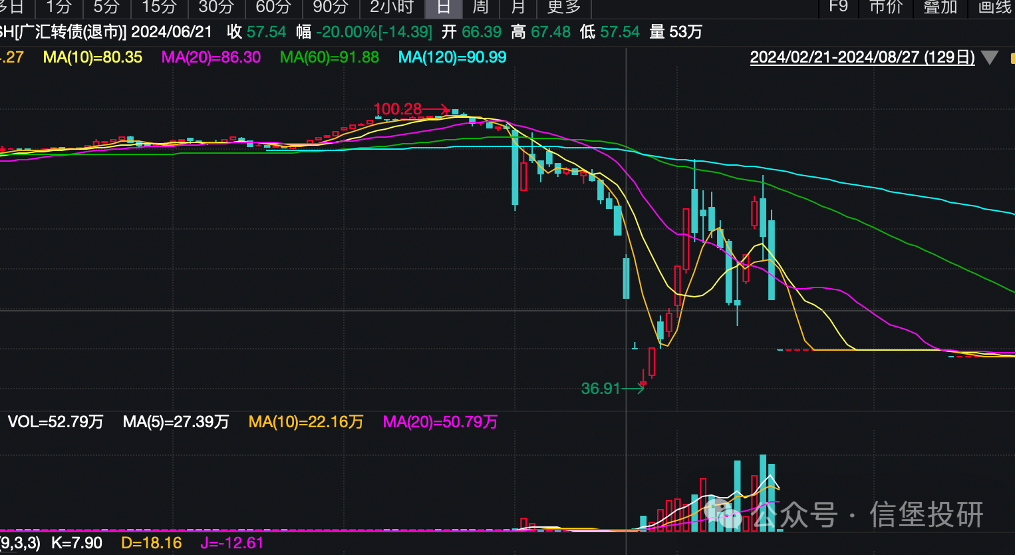 参考广汇2024年6月21日披露可能被终止上市的第一次风险提示性公告后,几乎是三个跌停板(-20%、-20%、-16.5%),从66跌至36.91,后通过股权转让等一波回光返照,退市收盘价45.77元。其他几只退市价格更低,退市前最后一个交易日的收盘价:搜特转债为17.67元、蓝盾转债为26.93元/张、鸿达转债为42.12元。