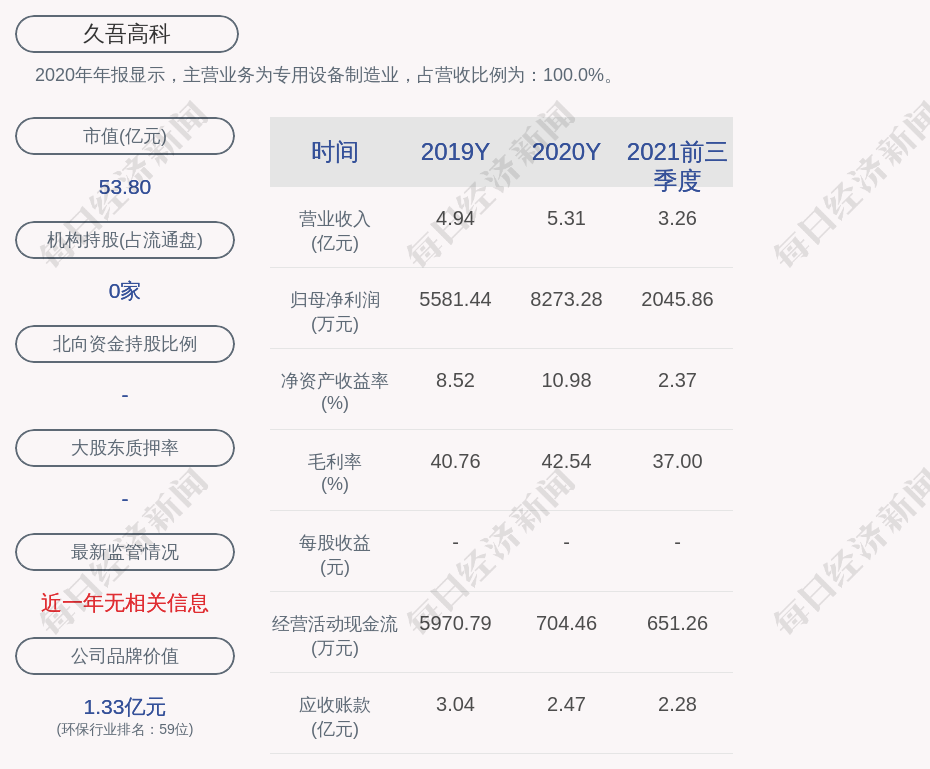 2020年年报显示,久吾高科的主营业务为专用设备制造业,占营收比例为:100.0%。