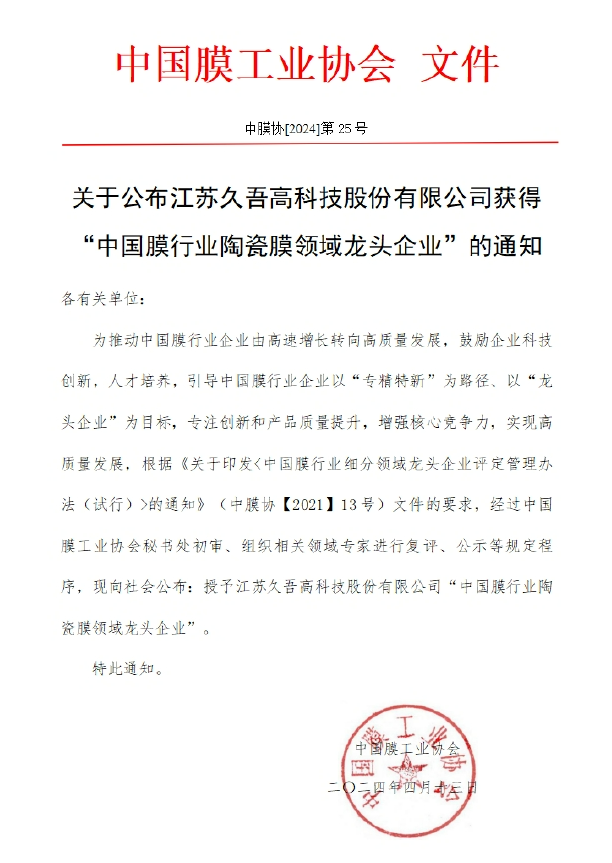 近日,中国膜工业协会公布江苏久吾高科技股份有限公司(以下简称“久吾高科”)获得“中国膜行业陶瓷膜领域龙头企业”的通知,经过中国膜工业协会秘书处初审、组织相关领域专家复评、公示等规定程序,授予久吾高科“中国膜行业陶瓷膜领域龙头企业”。
