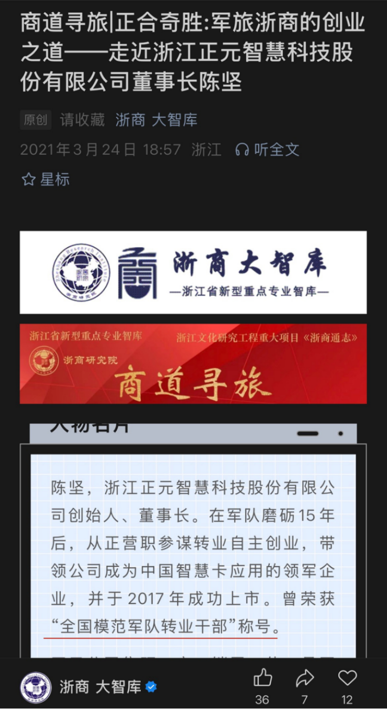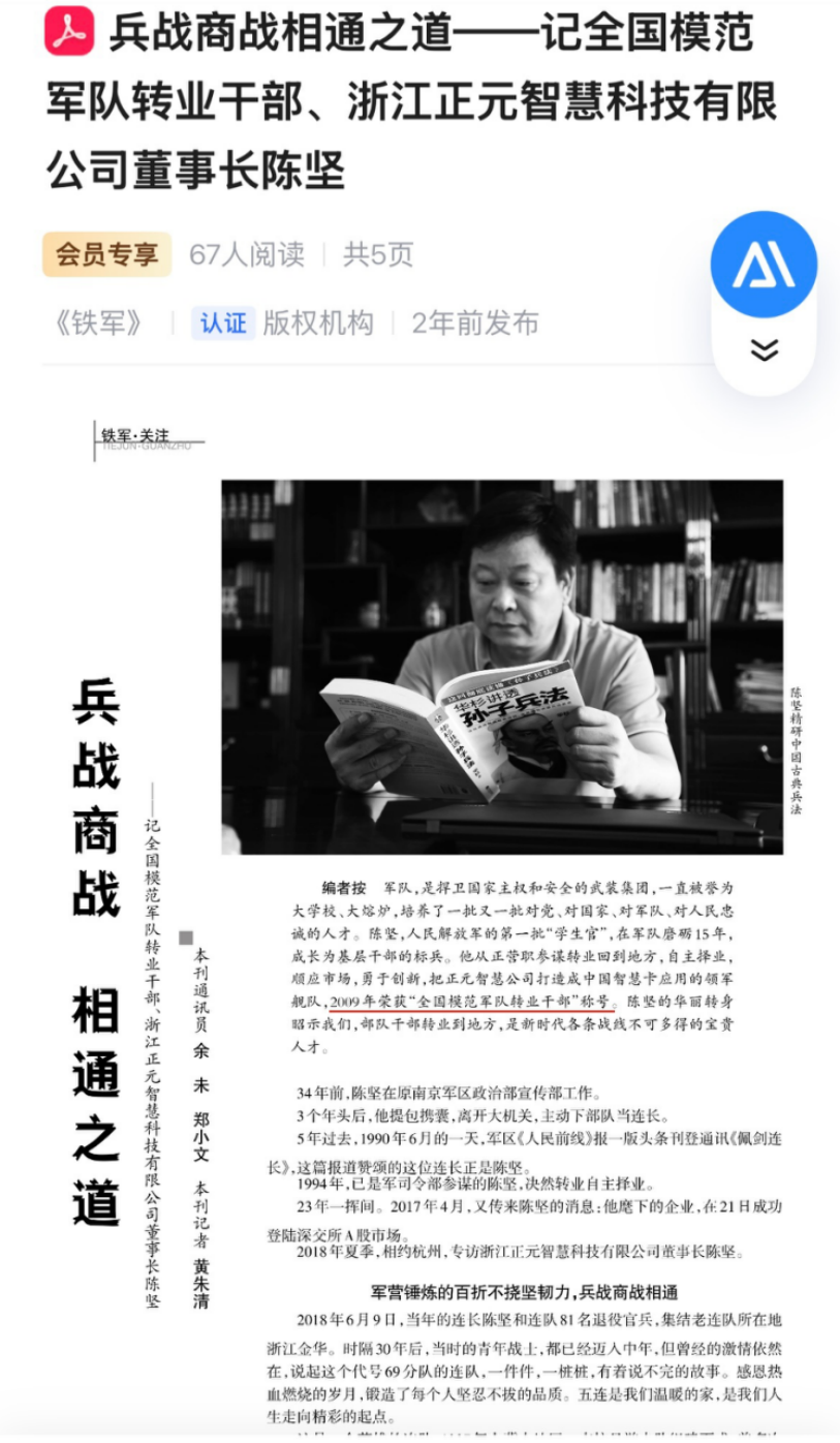 《铁军》杂志2018年9月发布的文章《兵战商战相通之道——记全国模范军队转业干部、浙江正元智慧科技有限公司董事长陈坚》开篇也提到,陈坚2009年荣获“全国模范军队转业干部”称号。