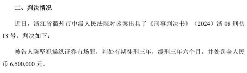 乙巳蛇年的最后一个交易日收盘后,浙江一家上市公司正元智慧(300645)2月13日晚间发布公告,公司实控人陈坚因犯操纵证券市场罪,被浙江省衢州市中级人民法院判处有期徒刑三年,缓刑三年六个月,并处罚金人民币650万元。