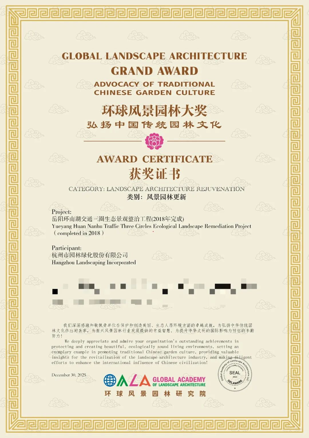 近日,环球风景园林研究院公布“环球风景园林大奖”评选结果,杭州市园林绿化股份有限公司承建的岳阳环南湖交通三圈生态景观整治工程、画境园两大精品项目,凭借卓越的设计营造水平与生态文化价值,双双斩获风景园林更新综合类大奖,以硬核实力彰显中国园林企业的专业水准与文化担当!