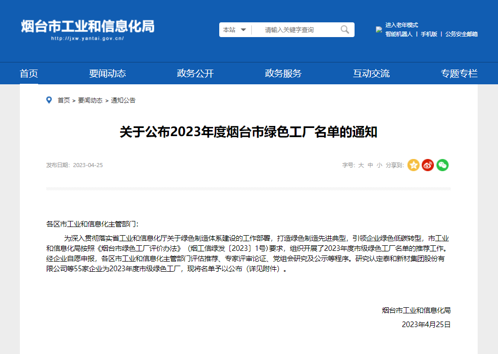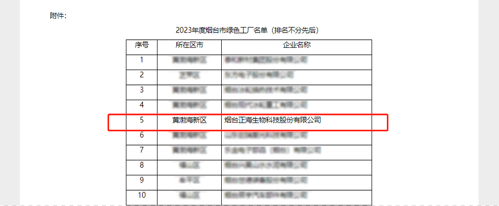 2023年4月25日,烟台市工业和信息化局公布了《2023年度烟台市绿色工厂名单》,正海生物名列其中,获批烟台市绿色工厂称号。
