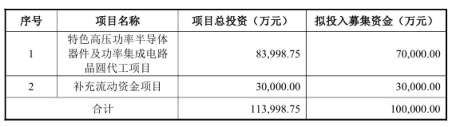 根据公告,公司拟发行股份募资不超过10亿元,其中7亿元用于特色高压功率半导体器件及功率集成电路晶圆代工项目,剩余3亿元全部用于补充流动资金。