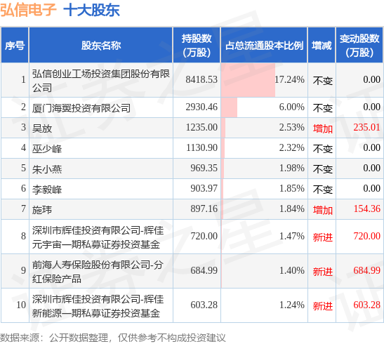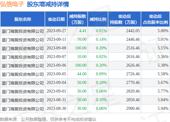 10月11日弘信电子发布公告《弘信电子:关于持股5%以上股东权益变动的公告》,其股东厦门海翼投资有限公司于2023年8月30日至2023年9月27日间合计减持488.41万股,占公司目前总股本的0.9999%,变动期间该股股价上涨16.48%,截止9月27日收盘报17.67元。