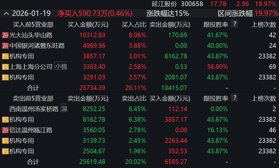 1月19日,延江股份开盘直逼“20cm”涨停,但随后几分钟内迅速回落至下跌约5%,振幅高达24.9%。经历半天巨震后,该股于午后强势拉升,最终以“20cm”涨停收盘。据Wind,延江股份近30个交易日累计涨53.94%。