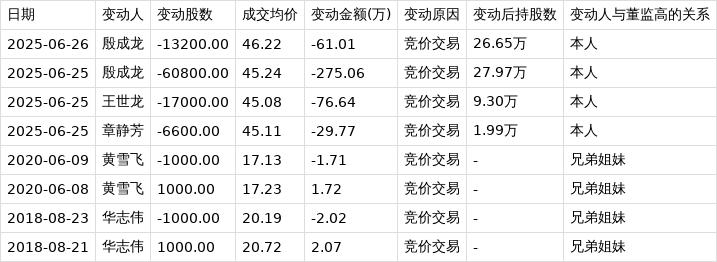 深交所公开信息显示,6月26日,江苏雷利董秘、董事、高管殷成龙在竞价交易公司股票,减持股数1.32万股,成交均价46.22元,变动金额61.01万元,变动后持股数为26.65万股。
