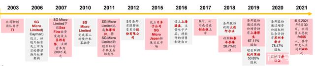 圣邦股份成立于2007年;2012年公司整体变更为股份有限公司;2017年创业板上市;2018年收购大连阿尔法,同年手头钰泰半导体28.70%股权;2019年通过收购和增资持有上海萍生67.11%股权,同年通过增资取得杭州深谙53.85%股权;2020年通过增资和股权转让持有苏州青新方78.47%股权;同年收购上海方泰;2021 年公司设立全资子公司江阴圣邦微,产业链拓展至设计以外的特种测试环节。