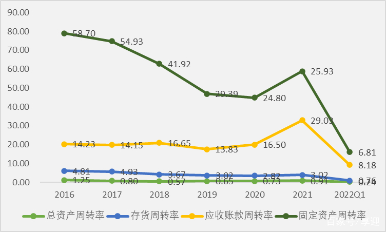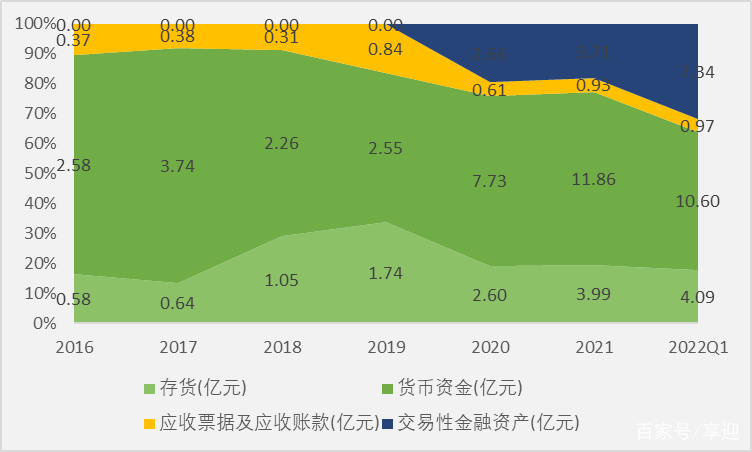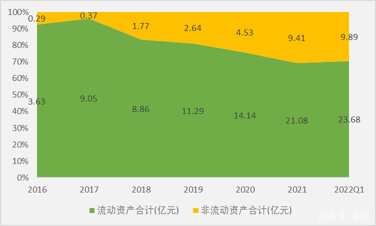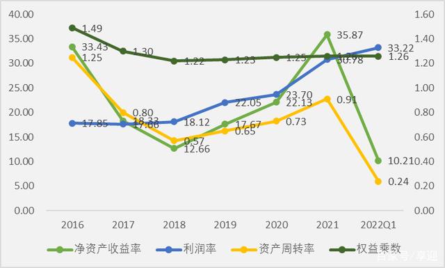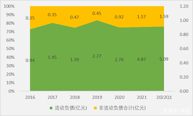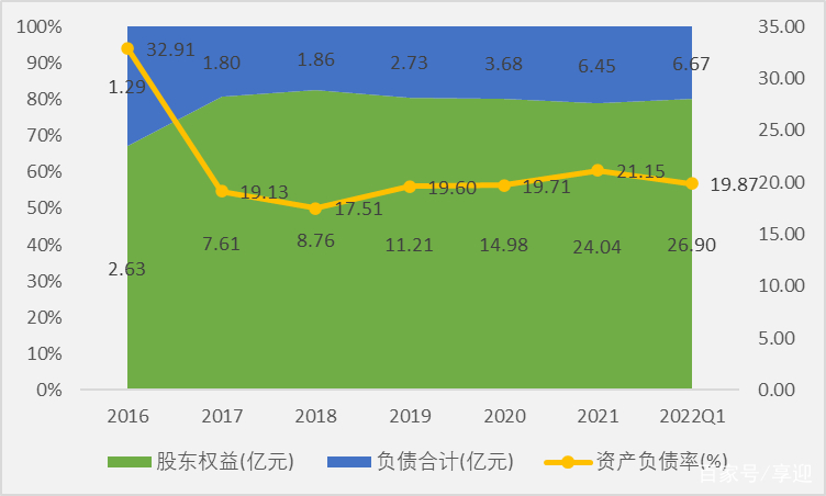 截止2022年Q1,公司总资产33.57亿元,股东权益26.90亿元,负债总额6.67亿元,资产负债率19.87%;负债方面,流动负债5.09亿元,占比76.31%,非流动负债1.59亿元,占比23.84%;资产方面,流动资产23.68亿元,占比70.54%,非流动资产9.89亿元,占比29.46%。