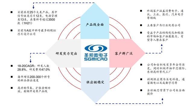 圣邦是国内最出色的模拟芯片设计公司之一,主因 1)产品线布局全面,龙头能力逐步显现;2)自身研发能力突出,通过外延并购持续扩张产品线;3)受益于产品结构优化和较强的市场和客户拓展能力,有望导入潜在客户;4)卡位优质供应链资源,产能有保障。