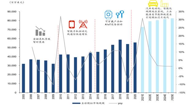 根据 WSTS 数据,2020 年全球模拟芯片市场规模达到 557 亿美元。复盘模拟芯片市场表现,呈现出下游应用广泛而分散、需求总体稳定的特点。金融危机时期需求疲软行业暂时衰退,2010 年开始受益于无线通讯的普及,智能手机革命引发需求爆发,模拟芯片行业快速发展,2015 年起可穿戴产品和 AIoT 设备驱动行业新一轮增长,2021 年受疫情和极端天气的影响,模拟芯片产能紧张,下游需求强劲,据 WSTS 预测,2021 年全球模拟芯片市场规模有望同比增长 30.9%达到 728 亿美元。展望后市,汽车电动化、智能化浪潮以及工业能源类节能降耗新需求将引发模拟芯片迭代,2025 年全球模拟市场规模有望达到825 亿美元,2021-2025CAGR 为 9.7%。