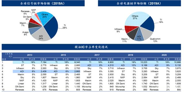 从全球市场来看,模拟芯片市场格局稳定且集中度低。从 2000 年以来,TI、ADI、Infineon、ST 始终稳定在前五名,头部玩家 NXP 和 ON Semi 分别从 Philips 和 Motorola 拆分,头部玩家地位相对稳定。2000-2020 年 top 10 模拟公司的总市占率从 56%提升至 63%,行业集中度有所提升,但相对于代工(台积电全球市占率达到 56%)等半导体子行业仍相对低。