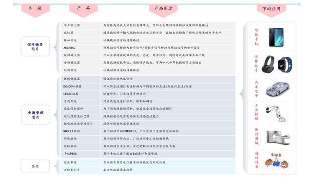 从大类看看,模拟电路分为通用模拟电路和特定用途模拟电路。公司所在的领域主要是通用模拟电路,主要分为电源管理类和信号链类,电源管理类产品市场规模更大。电源管理类芯片是所有电子设备的电能供应心脏,负责电子设备所需电能的变换、分配、检测等管控功能,对电子设备而言是不可或缺的,其性能优劣和可靠性对整机的性能和可靠性有着直接影响,电源管理芯片一旦失效将直接导致电子设备停止工作甚至损毁,是电子设备中的关键器件。信号链是指将自然界中存在的声、光、电磁波等连续的模拟信号转换为以 0 和 1 表示的数字信号,再由电子系统处理后转换为模拟信号输出的整个过程链。信号链模拟芯片是指拥有对模拟信号进行收发、转换、放大、过滤等处理能力的集成电路。