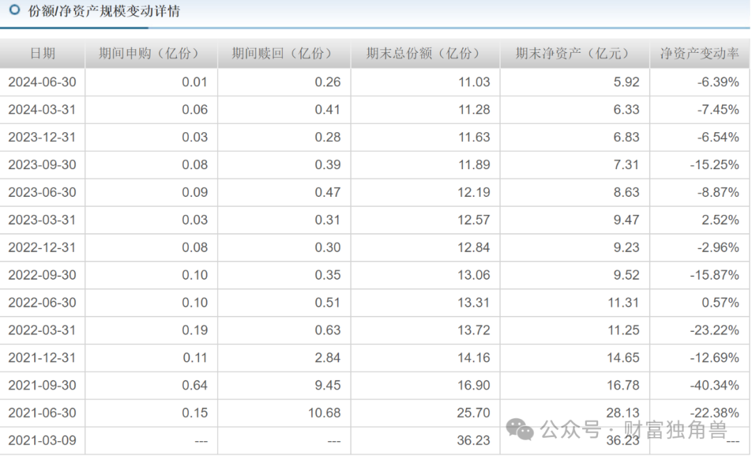 据天天基金网显示,博时创新精选混合A成立之初募集了36.23亿元,但笔者发现,基金刚成立不久,在2021年2季度就出现连续三个季度的大额赎回,2021年2季度被赎回了10.68亿份,2021年3季度被赎回了9.45亿份,2021年4季度被赎回了2.84亿份。经过3个季度的大额赎回,截至2022年1季度基金规模仅剩11.25亿元。后面的9个季度,该基金仍有份额被赎回,截至2024年6月30日,博时创新精选混合A基金,期末净资产5.92亿元,比上期减少6.39%。