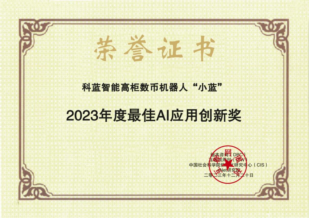 12月20日,由中国科学院《互联网周刊》、中国社会科学院信息化研究中心、eNet研究院、德本咨询联合主办的2023第二十一届中国互联网经济论坛“2023金i奖”榜单发布。该奖项旨在关注国产软件、信创、工业互联网、数字经济、专精特新等领域做出突出贡献的企业,科蓝软件凭借完全自研的智能高柜数币机器人“小蓝”在银行网点智能化转型进程中的大规模应用,荣获金融领域2023年度最佳AI应用创新奖。