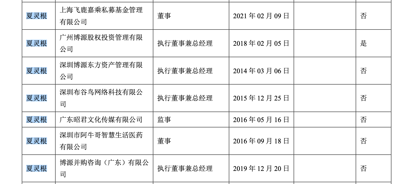 据年报显示,夏林根共在其他7家单位任职,分别在上海飞鹿嘉乘私募基金管理有限公司、深圳市阿牛哥智慧生活医药有限公司任董事;在广州博源股权投资管理有限公司、深圳博源东方资产管理有限公司、深圳布谷鸟网络科技有限公司、博源并购咨询(广东)有限公司任执行董事兼总经理;在广东昭君文化传媒有限公司任监事。其中仅在广州博源股权投资管理有限公司取报酬津贴。