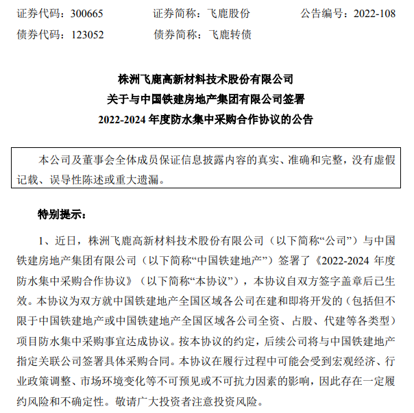 近日,株洲飞鹿高新材料技术股份有限公司(以下简称“公司”、“乙方”)公告,与中国铁建房地产集团有限公司(以下简称“中国铁建地产”、“甲方”)签署了《2022-2024年度防水集中采购合作协议》(以下简称“本协议”)。本协议为双方就中国铁建地产全国区域各公司在建和即将开发的(包括但不限于中国铁建地产或中国铁建地产全国区域各公司全资、占股、代建等各类型)项目防水集中采购事宜达成协议。按本协议的约定,后续公司将与中国铁建地产指定关联公司签署具体采购合同。