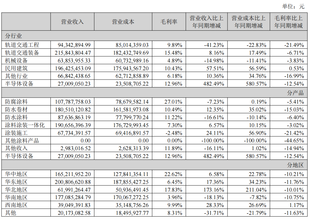 分产品来看,防腐涂料营收1.078亿元,同比下降7.23%;防水卷材营收1.805亿元,同比增长17.83%;防水涂料营收8763.69万元,同比下降16.61%;涂料涂装一体化营收1.907亿元,同比增长6.57%;涂装施工营收6773.44万元,同比下降7.97%;其他涂料产品营收0.00亿元,同比下降100.00%;其他收入298.30万元,同比下降16.11%;半导体设备营收2700.91万元,同比增长482.49%。
