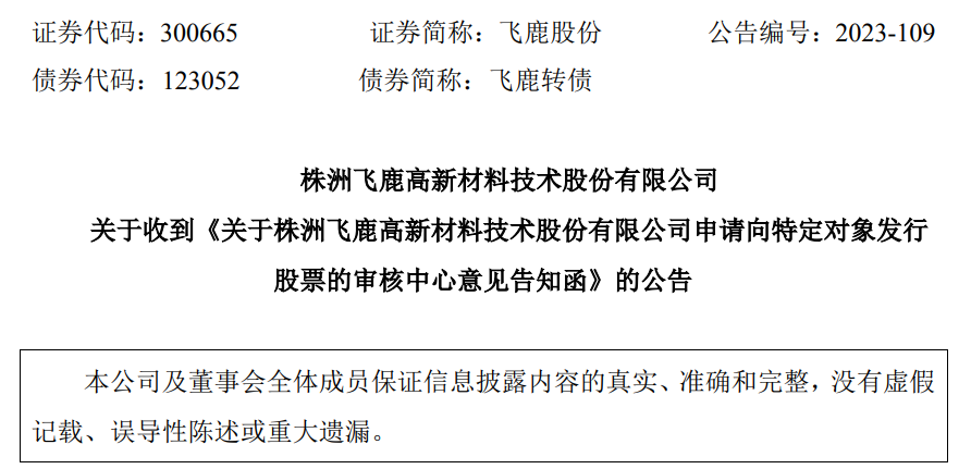 飞鹿股份(300665.SZ)昨日披露公告,公司于2023年11月15日收到深圳证券交易所上市审核中心出具的《关于株洲飞鹿高新材料技术股份有限公司申请向特定对象发行股票的审核中心意见告知函》,深圳证券交易所发行上市审核机构对公司向特定对象发行股票的申请文件进行了审核,认为公司符合发行条件、上市条件和信息披露要求,后续深圳证券交易所将按规定报中国证券监督管理委员会(简称“中国证监会”)履行相关注册程序。