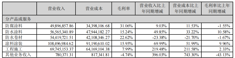 根据公开资料显示,飞鹿股份在2023年上半年的财务报告中表现出色,各项业务板块均呈现出稳健的增长态势,营业收入3.40亿元,同比增加33.91%。多个业务核心板块收入依然强劲,防腐涂料收入0.50亿元,同比增加9.03%;防水涂料收入0.57亿元,同比增加49.85%......在产品和营收增长情况下,防水卷材产品收入却遭遇了挑战,同比下降23.38%。