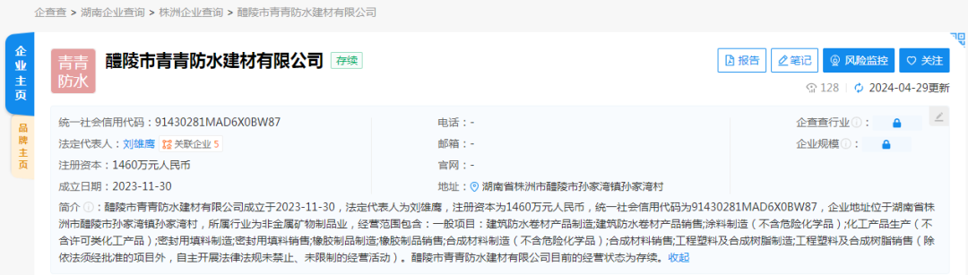青青防水成立于2023年11月,法人为刘雄鹰(飞鹿股份高管),注册资本1460万元,主营防水卷材的制造与销售,涂料制造,化工产品生产等,所属集团为飞鹿股份。公告显示,2018年飞鹿股份收购了湖南耐渗塑胶工程有限公司(下文简称“湖南耐渗”)100%股权,故持有湖南耐渗的孙家湾生产基地。后为方便资产管理,湖南耐渗设立了全资子公司青青防水,并将拥有的孙家湾生产基地资产转移至青青防水。