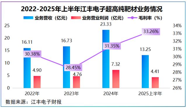 2025年上半年,公司先端存储芯片用高纯300mm硅靶实现稳定批量供货,超高纯靶材主营利润同比大增36.11%,毛利率同比提升约3个百分点,达33.26%。