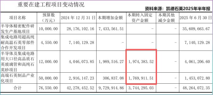财报显示,2025年上半年,凯德石英集成电路用大口径石英玻璃管工程以及高端石英制品产业化工程开始进入转固阶段,产能扩建提速。