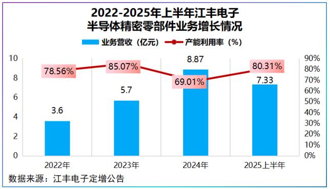 随着存储与先进制程景气度回升,公司半导体零部件产能利用率从2024年69.01%跃升到了2025年上半年的80.31%,产能逐步释放。