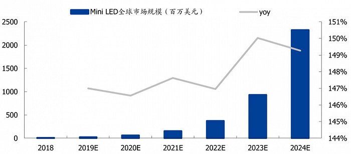 MiniLED市场近年来呈现爆发式增长,根据市场调查机构Arizton的预测,到2024年之前,全球MiniLED年复合增长率都维持在100%以上。