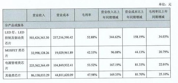 富满电子业务包括LED驱动芯片、电源管理芯片、MOSFET芯片等。在所有业务板块中,LED驱动芯片增长最快,收入规模从2020年上半年的1.13亿元增长至2021年上半年的5.03亿元,增长344%,毛利率也是所有业务中提升最大的,达到52.88%,相比上年同期增加34个百分点。
