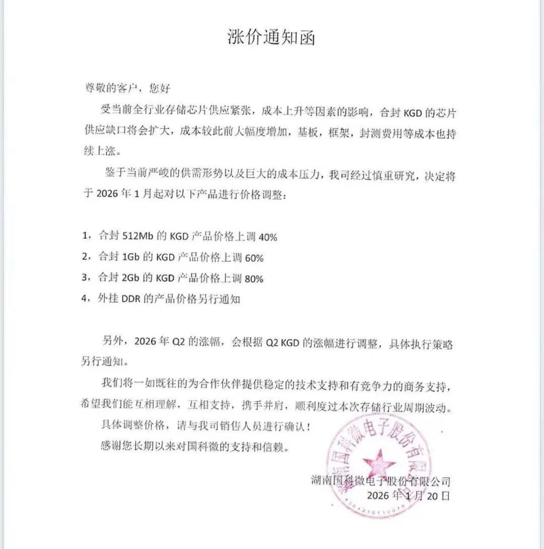 值得一提的是,在披露业绩预亏前,一份落款为1月20日的涨价通知函显示,国科微宣布自2026年1月起对部分产品执行价格调整:合封512Mb的KGD产品涨价40%,合封1Gb的KGB产品涨价60%,外挂DDR的产品价格则另行通知。通知函同时指出,2026年第二季度的价格将根据KGD市场行情变化相应调整,具体执行细则后续公布。