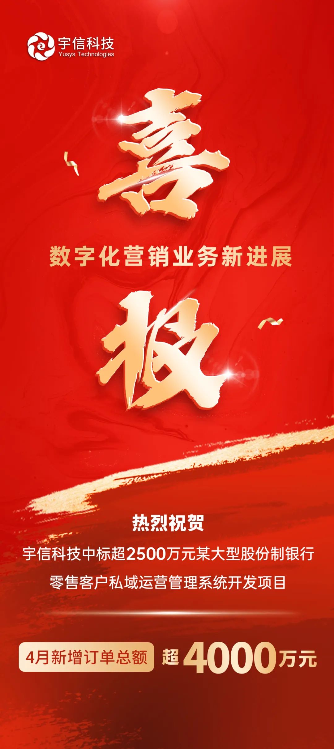 阳春四月,宇信科技数字银行业务发展迅猛,在数字化营销领域接连迎来中标喜讯,累计新增实施类订单总额已突破4000万元。这其中,凭借领先的私域营销自研产品优势和丰富的项目经验,公司成功中标了超2500万元的某大型股份制银行零售客户私域运营管理系统开发项目。这是宇信科技斩获的规模较大、极具代表性的私域营销平台建设部署项目,标志着公司在私域营销运营领域市场开拓取得的里程碑式进展,为后续扩大在银行业务运营领域市场版图奠定了坚实的基础。
