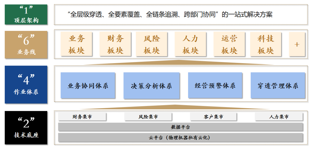 该方案主要建设的内容可以简单概括为“1-6-4-2”,即“1”个数字化顶层规划、“6”个核心业务线、“4”个重点作业体系以及“2”大技术底座险管理系统。其中,1个顶层规划是指结合监管发文以及内部管理需要,评估当前数字化现状,构建以穿透管理为主线的数字生态及实施路线图;6个核心业务线,则是围绕企业管理中的业务、风险、运营、人力、财务、科技等6大核心领域,初步建立数字化管控图谱,以数字技术构建企业跨界融合的数字生态;4个作业体系是指围绕数字管控建设的核心支撑体系,包括业务协同(六横六纵实现所属各业态的协同管理)、决策分析(支持数字化决策及归因分析)、经营预警(机防代替人防)以及穿透管理(实现企业闭环式管理);2大技术平台则包括国资穿透式管理云平台以及基础数据技术平台,从而实现从数据采集、加工到分析、预警的全流程数字化管理模式。