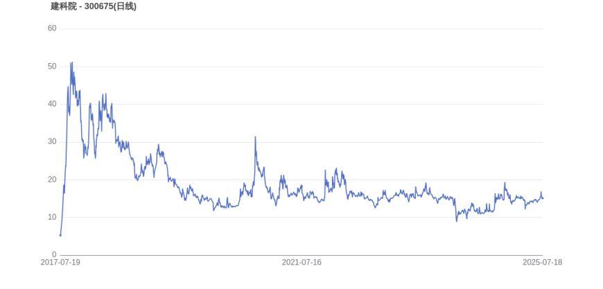 从上市首日至今,建科院的市值实现了1.87倍的增长。2017年9月18日,建科院的市值巅峰达到77.35亿元,股价也顺应升至52.74元。而至7月18日收盘,建科院的股价为15.13元,市值为22.19亿元,相比峰值时期市值减少55.16亿元,市值蒸发了71.31%。