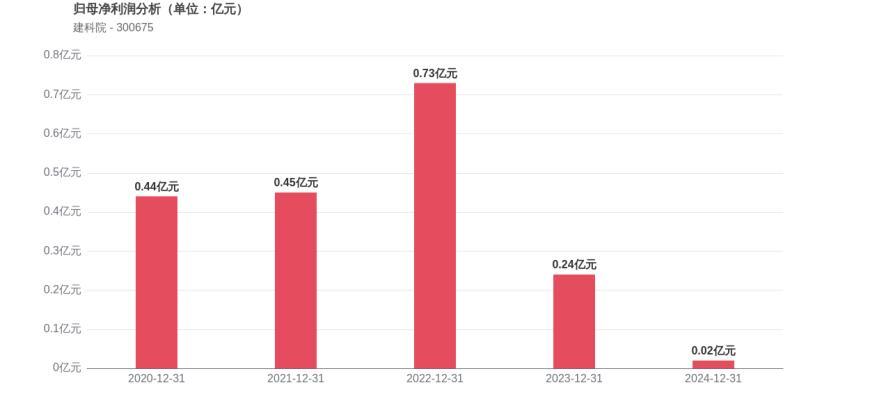 利润角度分析,2020年建科院实现归母净利润0.44亿元,2024年0.02亿元。归母净利润大幅萎缩,降幅达95.45%。