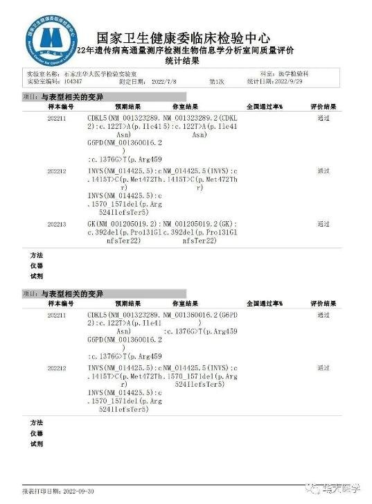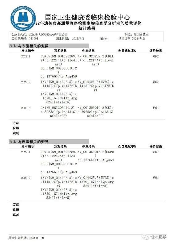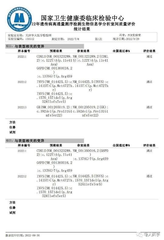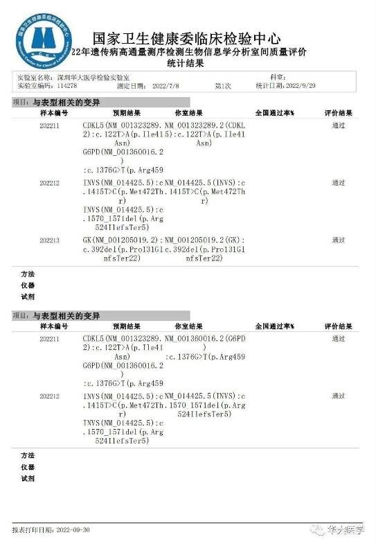 近日,国家卫生健康委临床检验中心公布了《2022-NCCL-遗传病高通量测序检测生物信息学分析室间质量评价报告》,华大基因深圳、武汉、天津、石家庄4家检验实验室均满分通过!