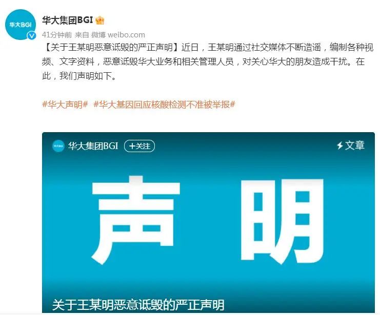 王德明在文章中称,举报人本人实名举报华大基因核酸检测不准,负一切法律责任。