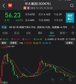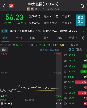 周一华大基因低开5%,随后一度下跌超7%,收盘报56.23元/股,下跌4.61%。总市值232.7亿元。