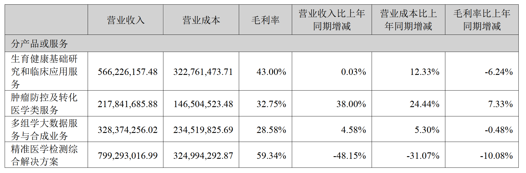 财报数据显示,华大基因共有精准医学检测综合解决方案、生育健康基础研究和临床应用服务、多组学大数据服务与合成业务、肿瘤防控及转化医学类服务四大业务,今年上半年分别实现7.99亿元、5.66亿元、3.28亿元、2.18亿元收入。