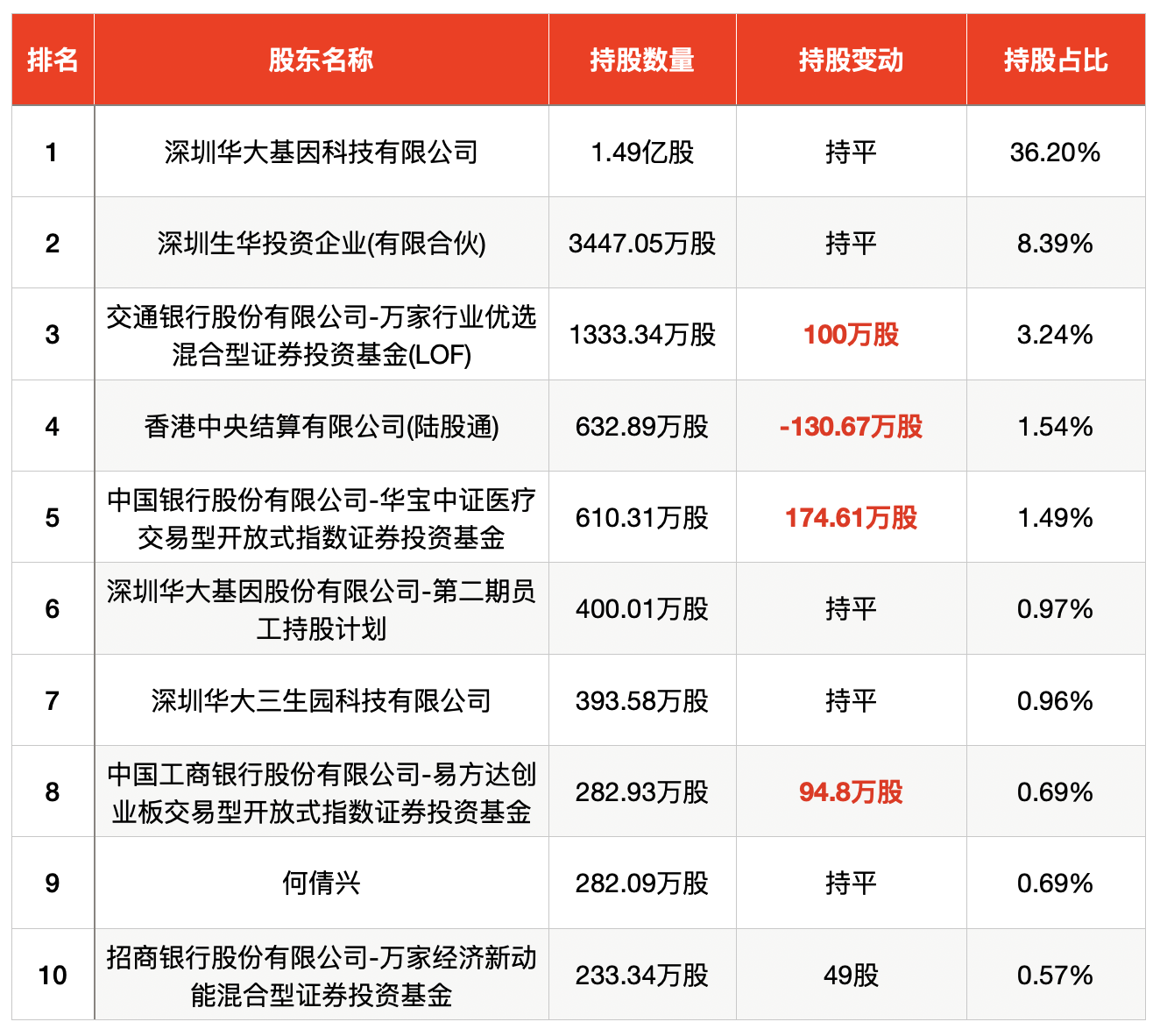 澎湃新闻注意到,华大基因半年报中,四大流通股东持股发生了变动,其中三只基金进行了加仓。