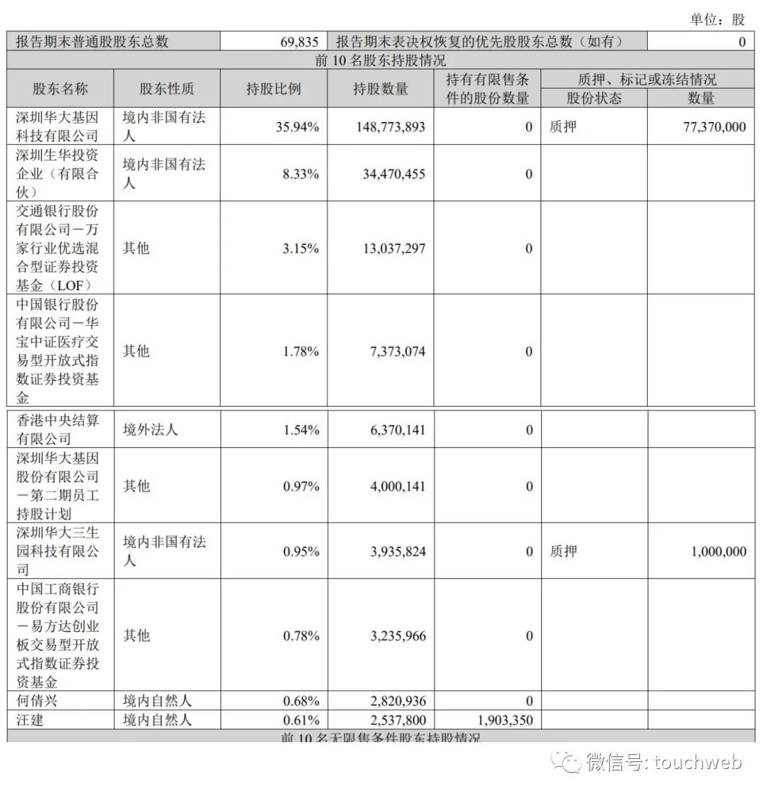 截至2023年9月30日,华大基因持股为35.94%,深圳前海华大基因投资企业(有限合伙)持股为8.33%,交通银行股份有限公司-万家行业优选混合型证券投资基金(LOF)持股为3.15%,中国银行股份有限公司-华宝中证医疗交易型开放式指数证券投资基金持股为1.78%,香港中央结算有限公司持股为1.54%;