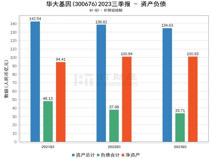 在资产负债方面,华大基因2023年三季报显示,公司的总资产为134.63亿元,相比上年度末的143.85亿元有所下降。负债合计为33.71亿元,较上年度末的41.64亿元有所减少。净资产为100.93亿元,较上年度末的102.21亿元略有减少。资产负债率为25.04%,较上年度末的28.94%有所降低。