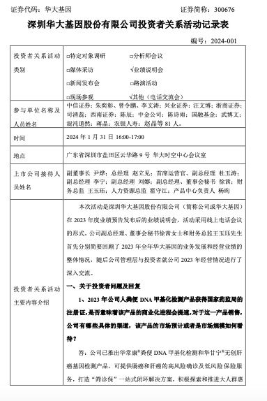 本次活动是华大基因在2023年度业绩预告发布后的业绩说明会,活动采用线上电话会议的形式。公司副总经理、董事会秘书徐茜和财务总监王玉珏首先分别简要回顾了2023年全年华大基因的业务发展和经营业绩的整体情况,随后公司管理层与投资者就公司2023年经营情况进行了深入交流。
