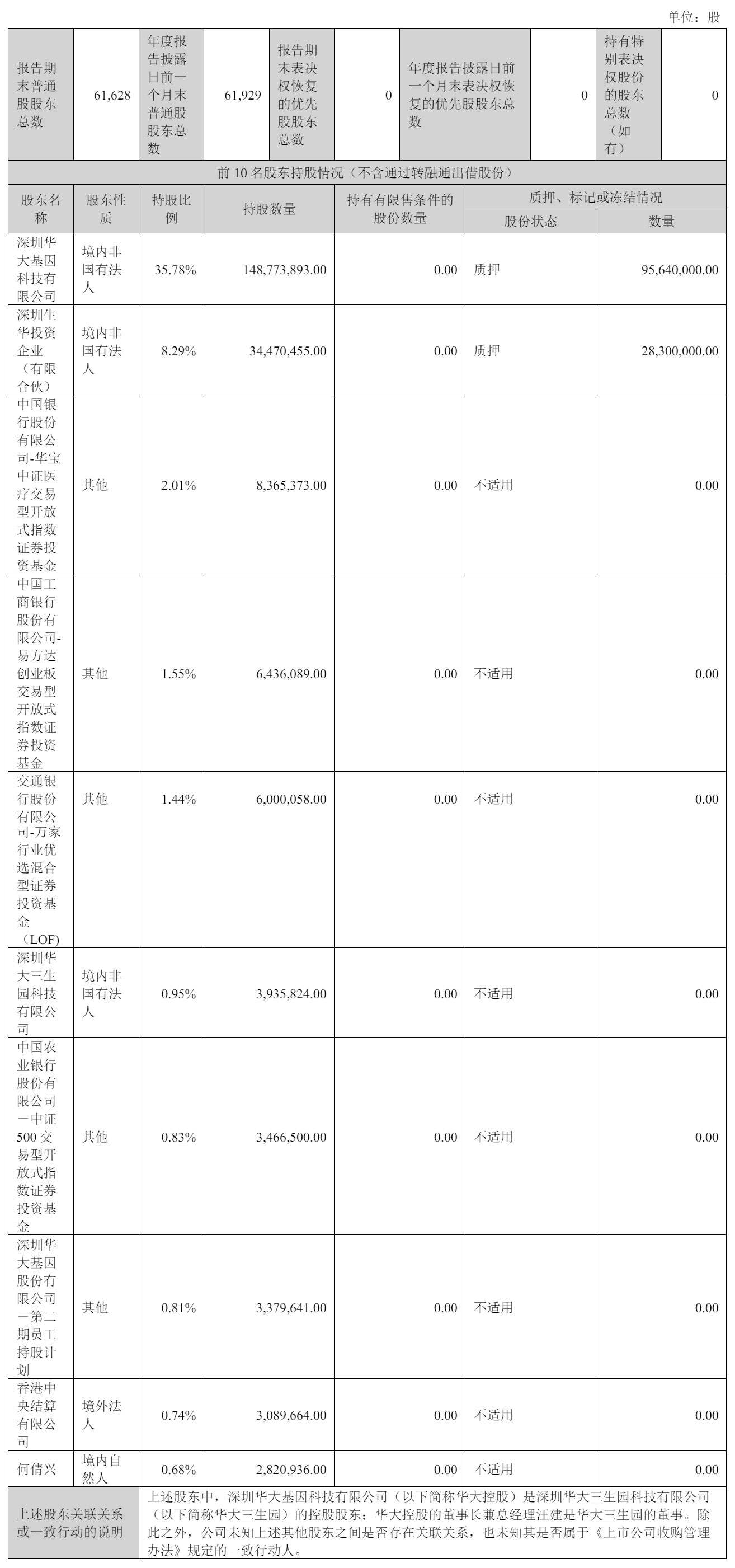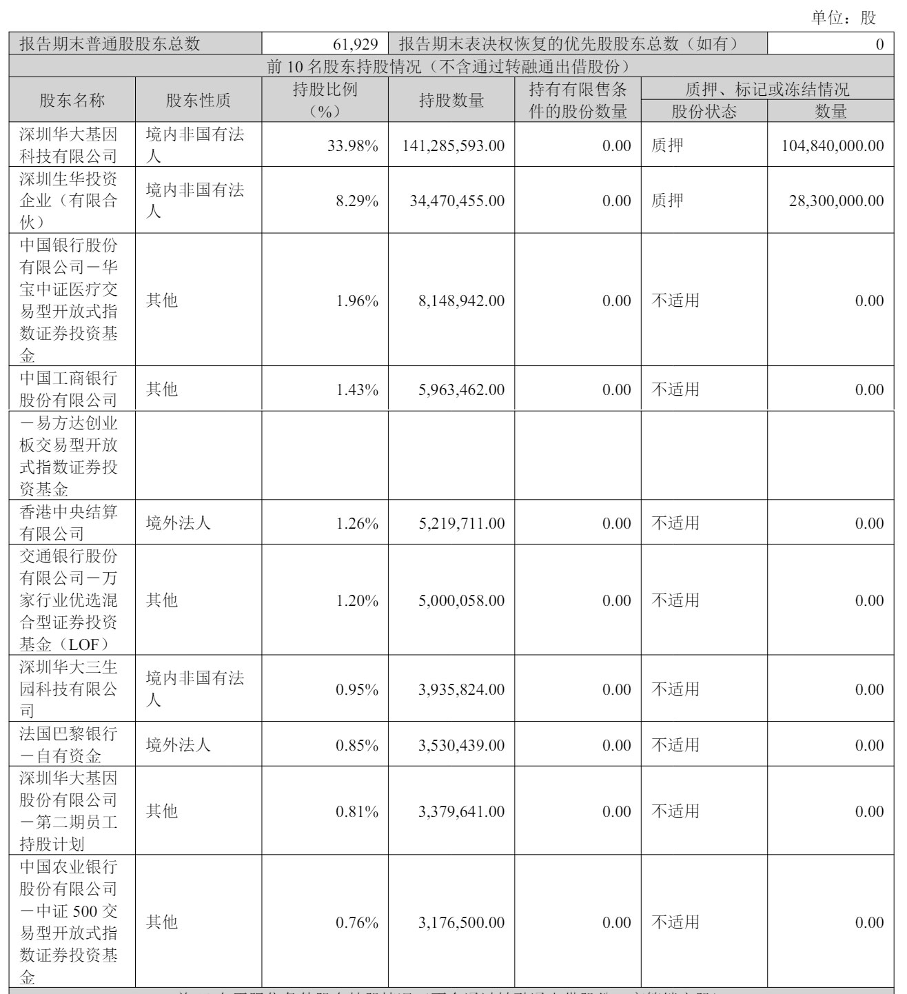 截至2025年3月31日,深圳华大基因科技有限公司(简称:“华大控股”)持股为33.98%,深圳前海华大基因投资企业(有限合伙)持股为8.29%,中国银行股份有限公司-华宝中证医疗交易型开放式指数证券投资基金持股为1.96%,中国工商银行股份有限公司-易方达创业板交易型开放式指数证券投资基金持股为1.43%,香港中央结算有限公司持股为1.26%;