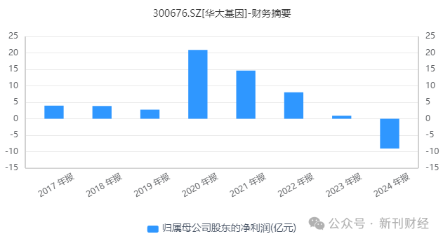 华大基因从2017年6月IPO登录深交所创业板,至今已有8年,虽然是归母净利润首度亏损,但其下降趋势早已显现。归母净利润在2020年取得20.90亿元的佳绩后,连续四年缩减,2023年时只剩0.93亿元,趋近于零,2024年则转亏9.03亿元,同比下降幅度达到惊人的1071.68%,扣非净利润的数据更加低迷,金额为-9.19亿元,同比降幅高达1090.83%。