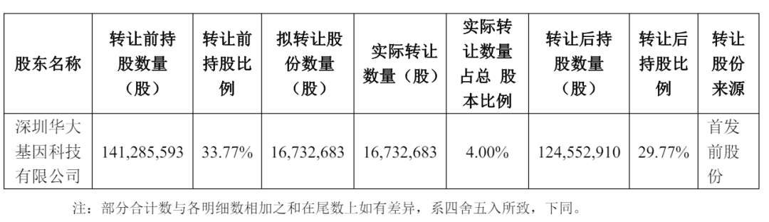 减持后,华大控股持股29.7748%,华大基因创始人汪健直接持股为0.6067%,深圳华大三生园科技有限公司持股为0.9409%。